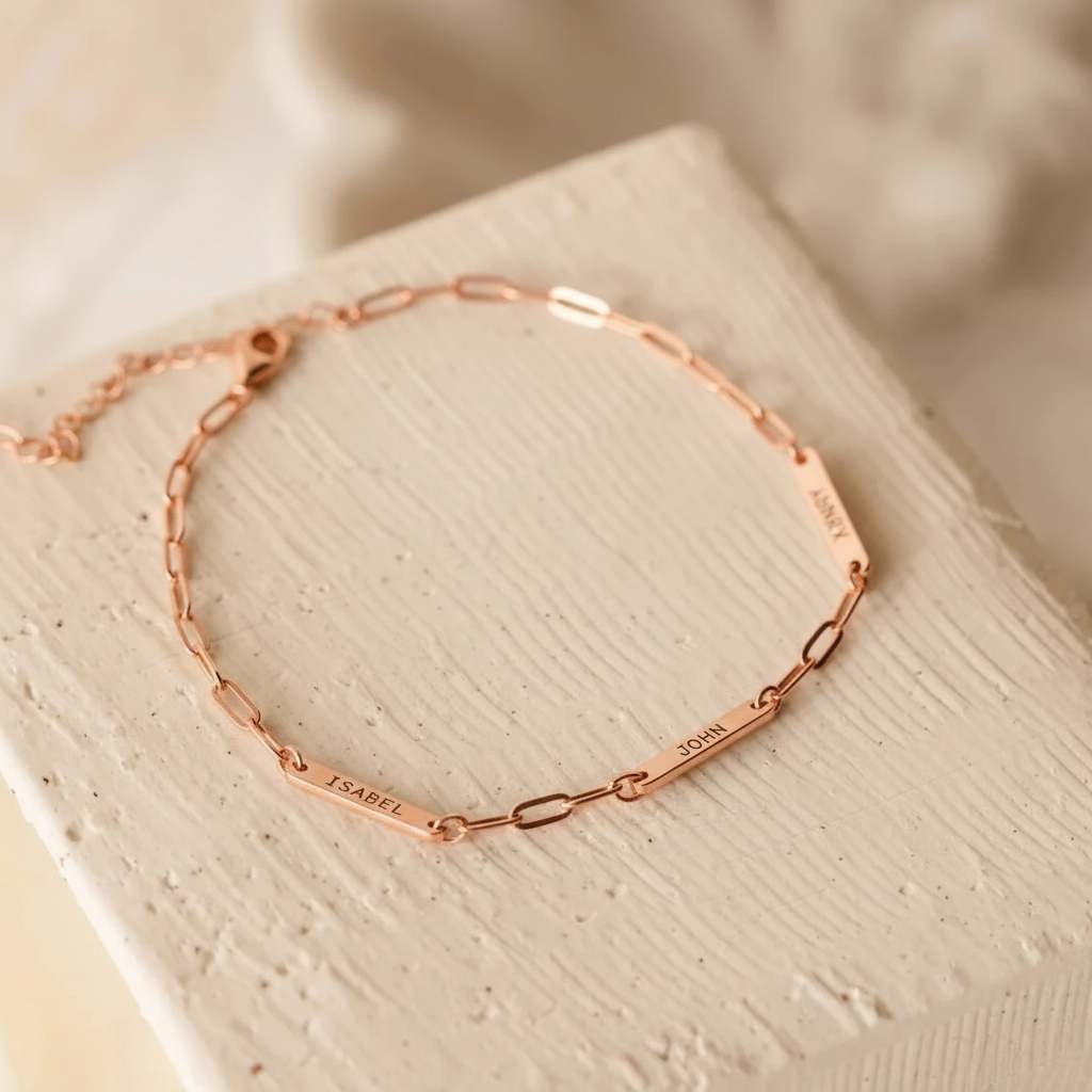 Celebrate your unique connection with the exquisite NuCœur Signature Link Bracelet. Crafted from high-quality stainless steel, this bracelet features a sleek, modern design with a custom laser-engraved tag, perfect for showcasing your loved one’s name or a meaningful word.